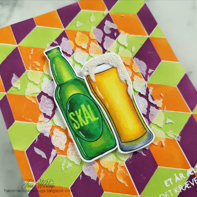 I popped up the images with craft foam and white heat embossed a danish sentiment from the same stamp set. It means "Another year older, that calls for a beer".